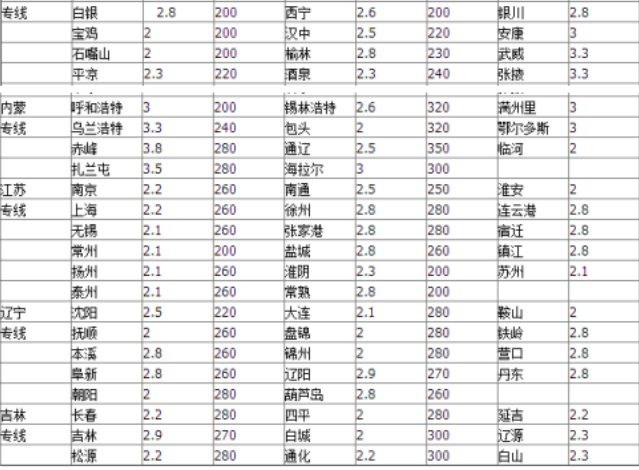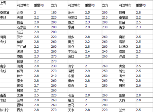 2、圓通速遞:江浙滬8元不限制重量,云南,四川,重慶,貴州,寧夏,吉林,甘肅,青海,黑龍江,山西,廣西首重15元續重12元,內蒙古首重20元續重18元,新疆首重28元續重22元。